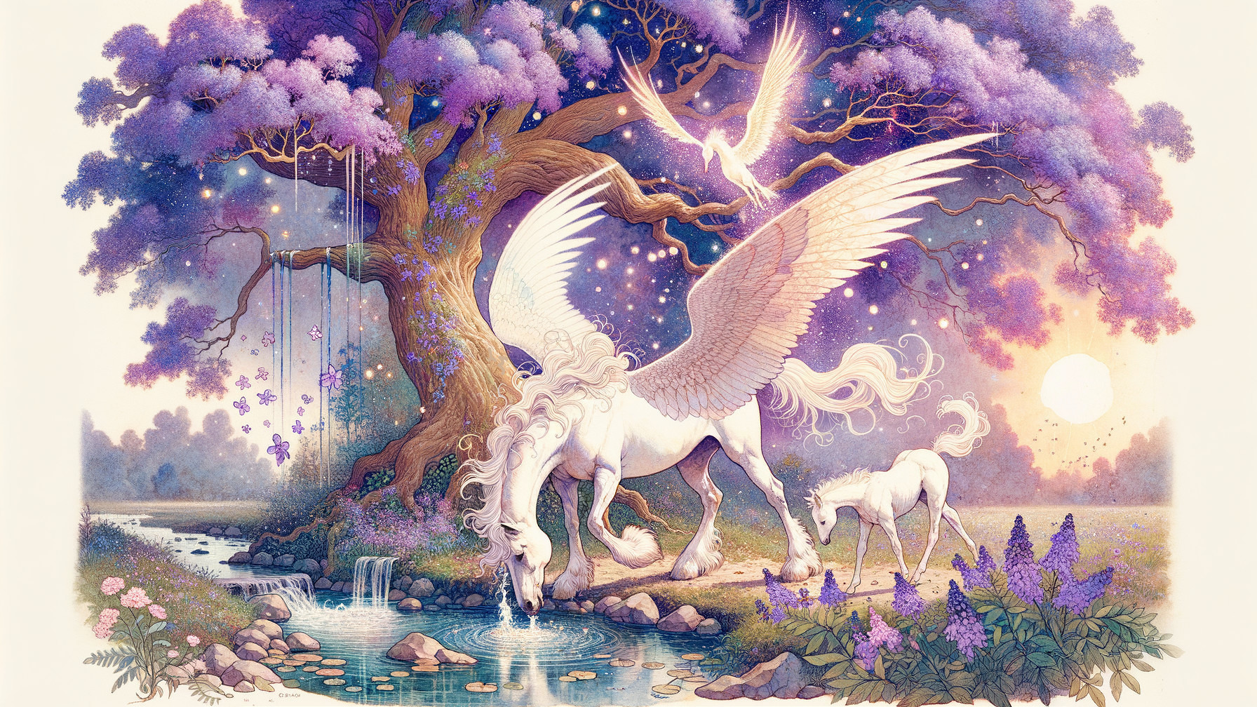 A serene scene unfolds with a majestic white Pegasus and her foal drinking by a creek under a Jacaranda tree.
