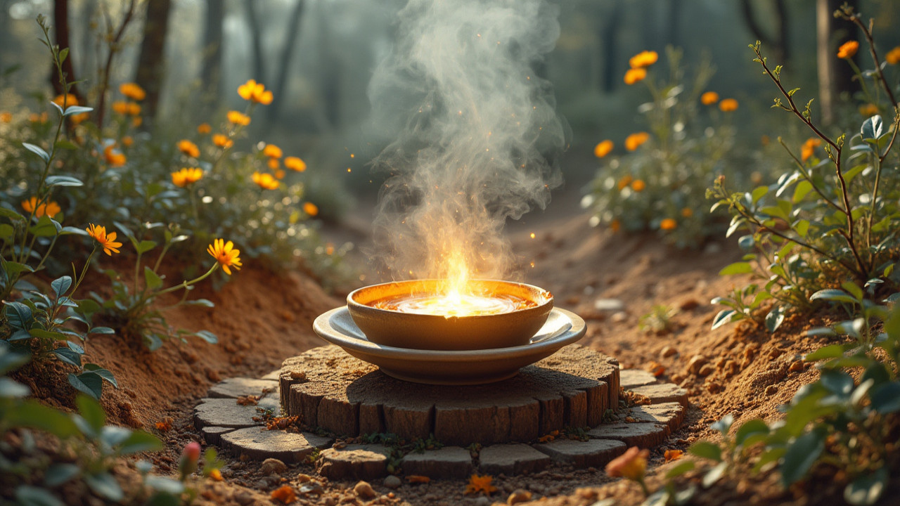 A whimsical Victorian home boasts a vibrant red crystal spire and ornate details. Surrounded by lush gardens and a serene reflecting pool, it radiates warmth with its glowing red glass windows.