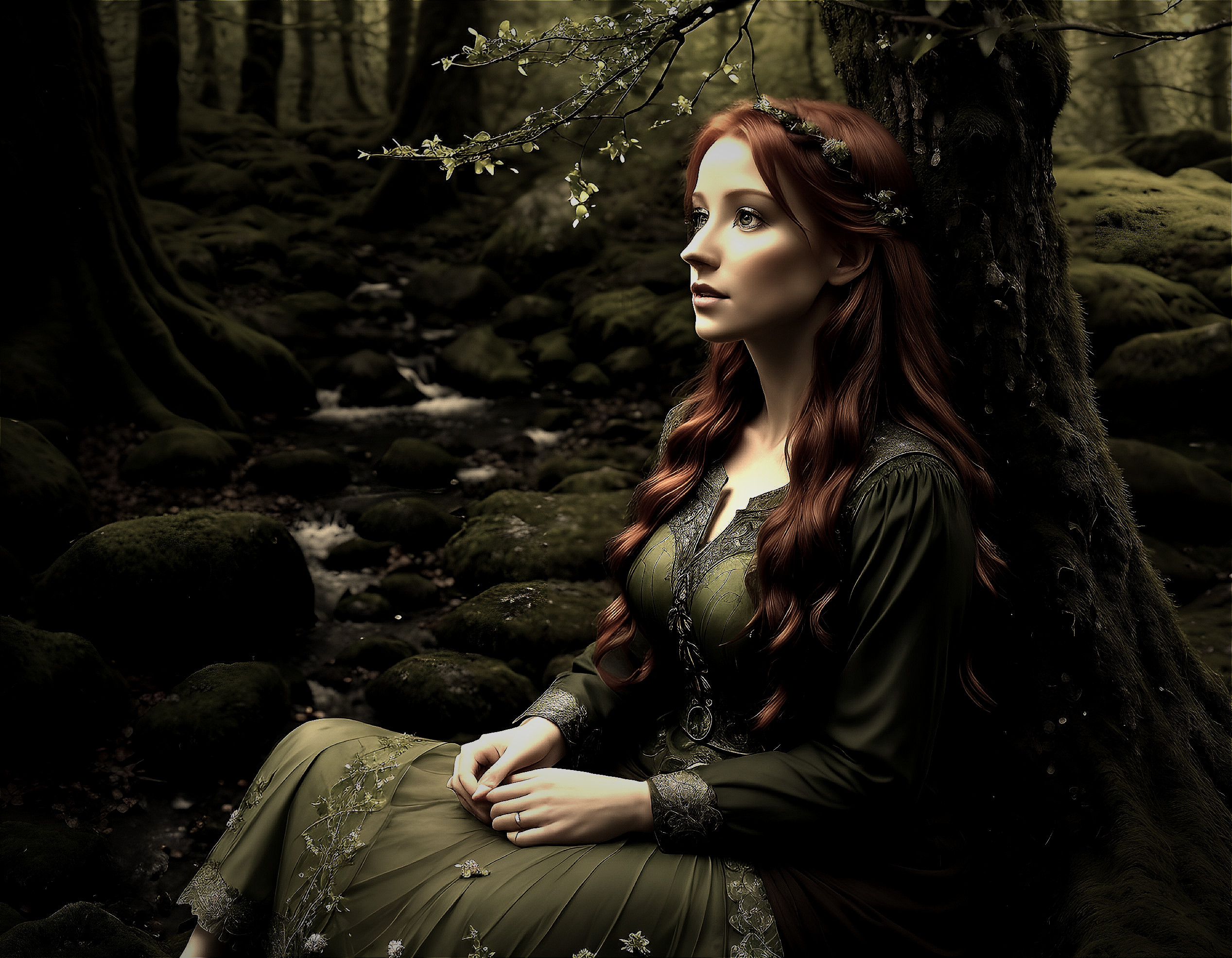 A woman with red hair in a green medieval dress sitting by a tree in a mossy forest, exuding an ethereal aura.
