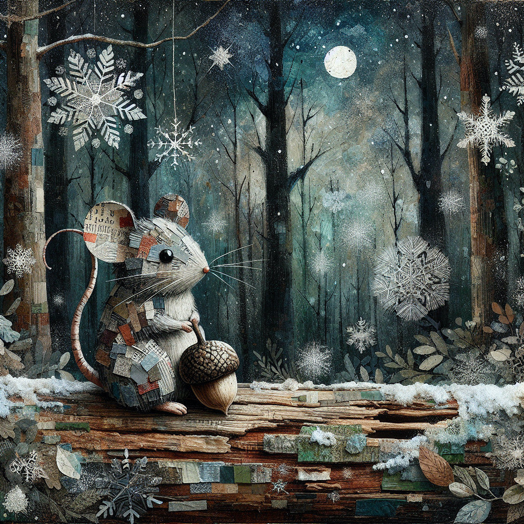 A charming mouse sits on a log, holding an acorn amidst a snowy forest. Surrounded by delicate snowflakes, the scene is mystical with deep, shadowy trees and a glowing moon above.