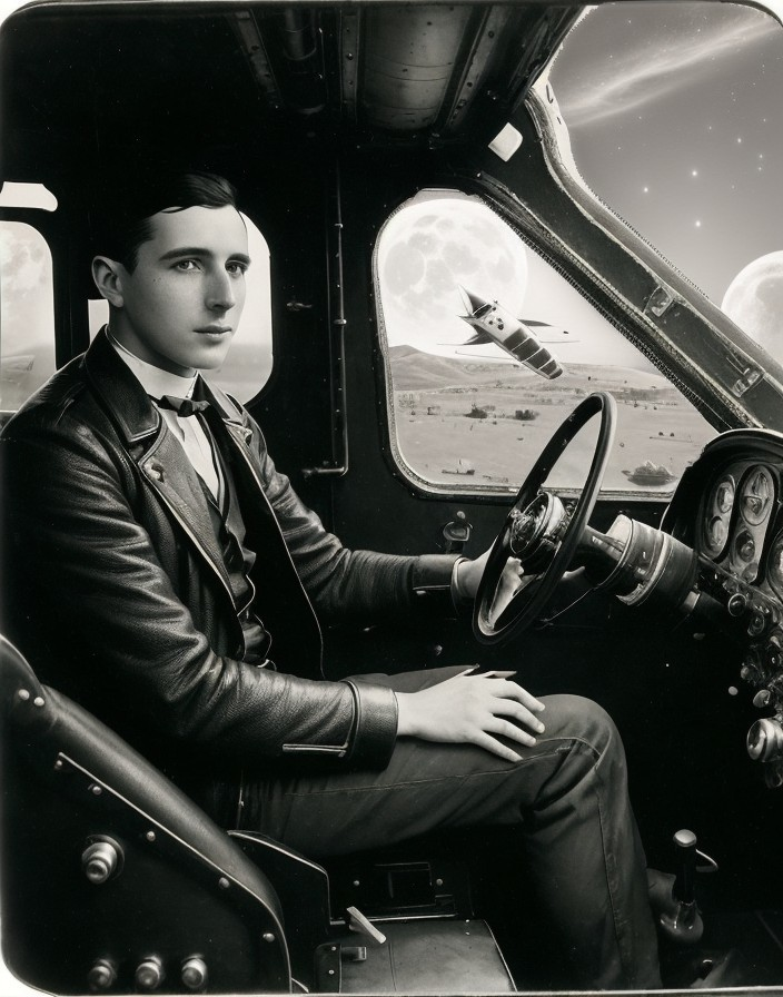 Prompt: "Young man in the cockpit of a pre war rocketship circa 1920, adventurous, confident, daguerreotype photography, silver nitrate photography, very old foto, science fiction elements, retrofuturistic, retrofuturism, technology, bakelite, rubber, brass metal, cast iron, vintage"