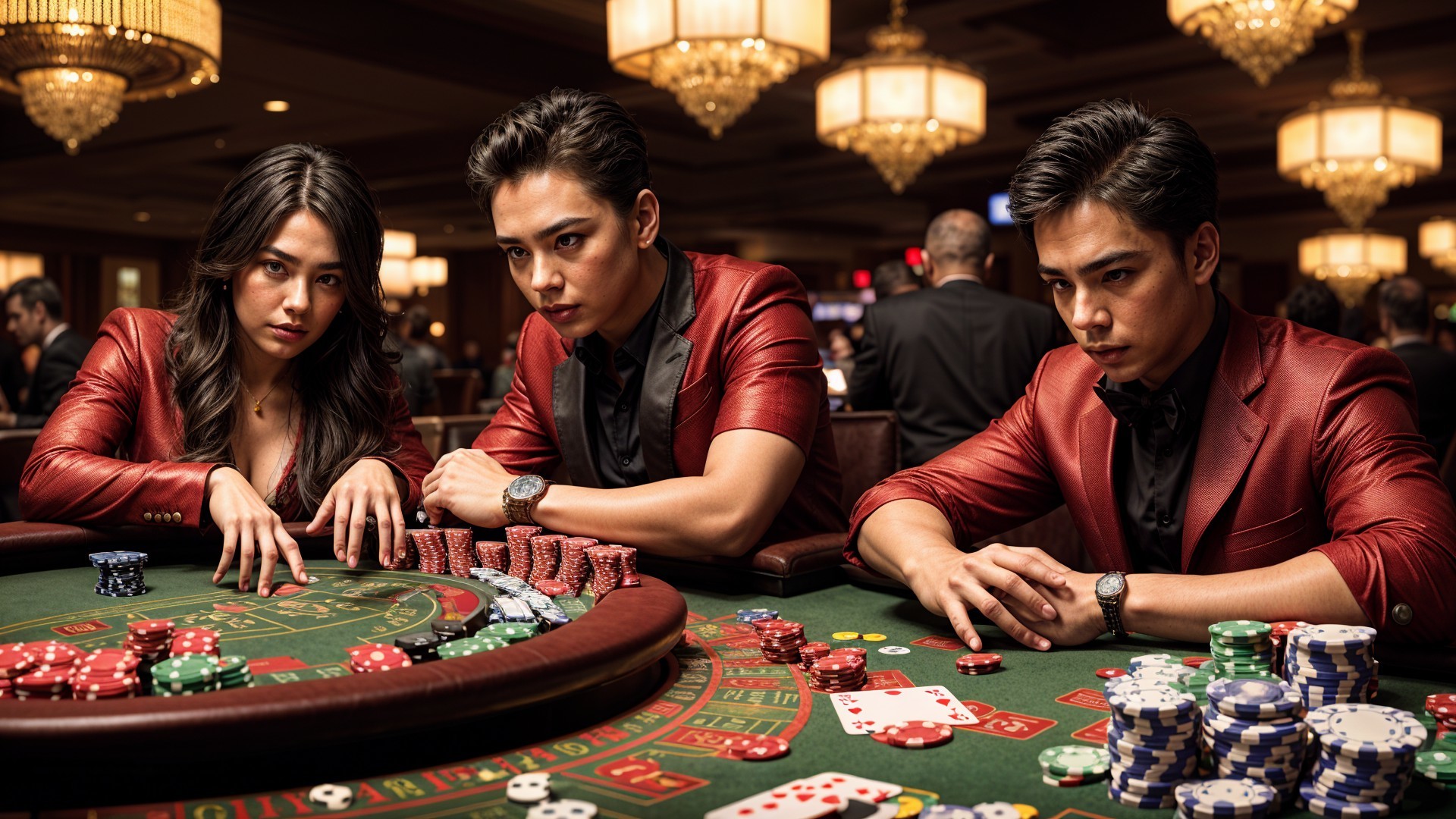 An award-winning photograph captures a vibrant casino scene with intricate details and dynamic, cinematic lighting. The hyperrealistic view showcases colorful elements in sharp focus, creating an enchanting atmosphere.
