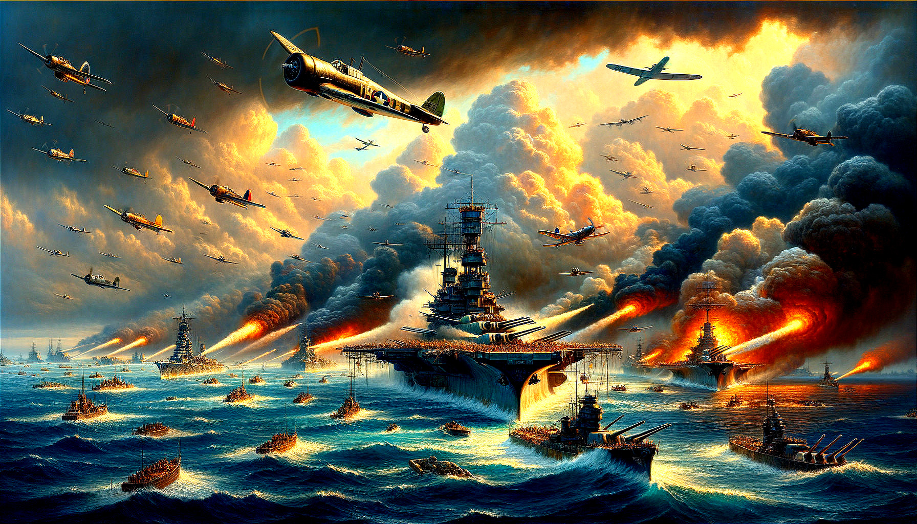 stunning oil painting depicting the Battle of Midway in World War II with intricate details of warplanes, battleships, explosions, and vivid imperial colors. This masterpiece captures the tragedy and epic nature of the historic event in hyperrealistic 16K UHD HDR quality.
