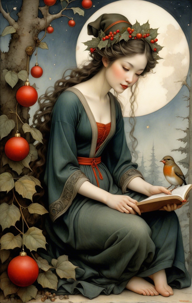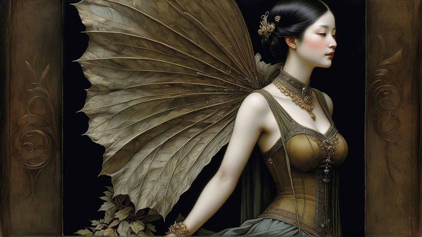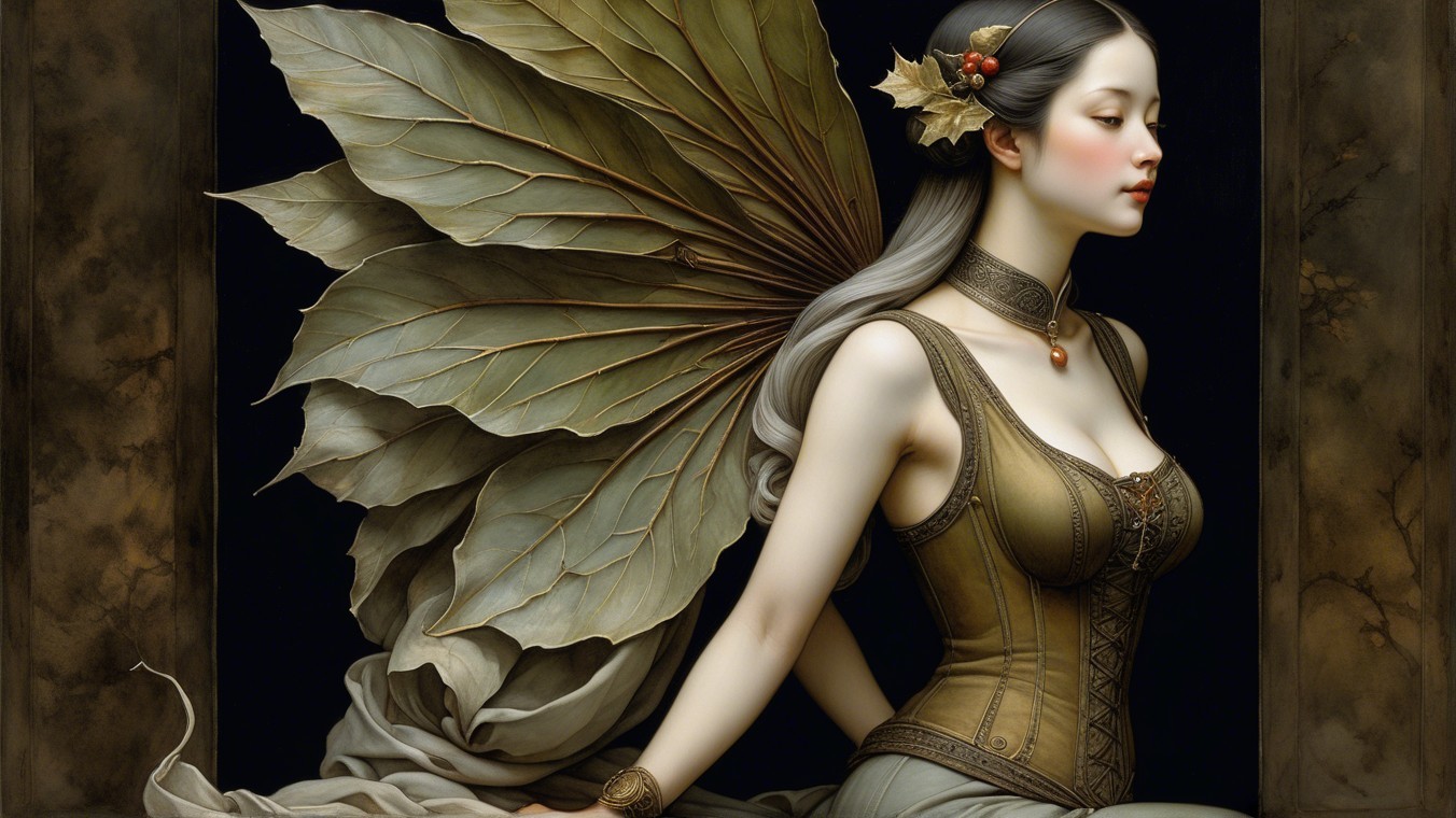 A mystical forest figure with antlers sits gracefully amidst lush greenery. Dressed in an elegant gown, she embodies enchantment and nature’s beauty, exuding a serene and magical aura.