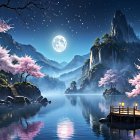 A mystical scene unfolds with pink cherry blossom trees beside a tranquil lake, a grand castle rising in the background under a starry sky, illuminated by a large moon and distant planets.