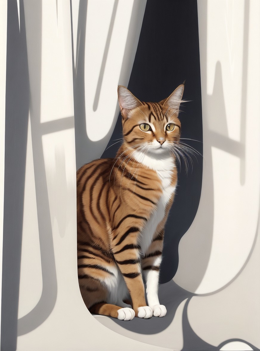 A cat with striking orange and black stripes is peering through a white curtain with sunlight casting shadows on the wall.