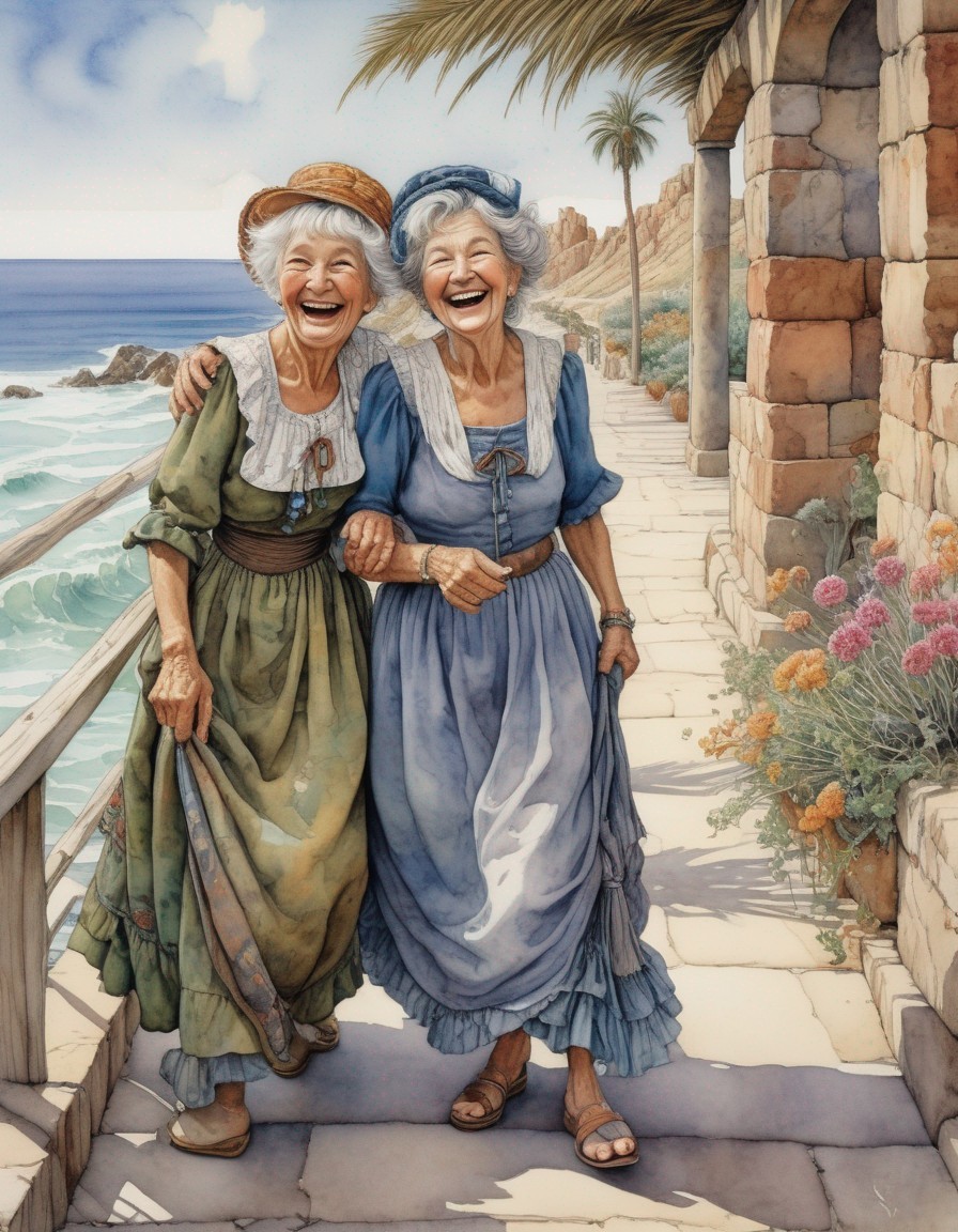 Two elderly women laughing joyously together on a sunny coastal walkway lined with flowers and plants.