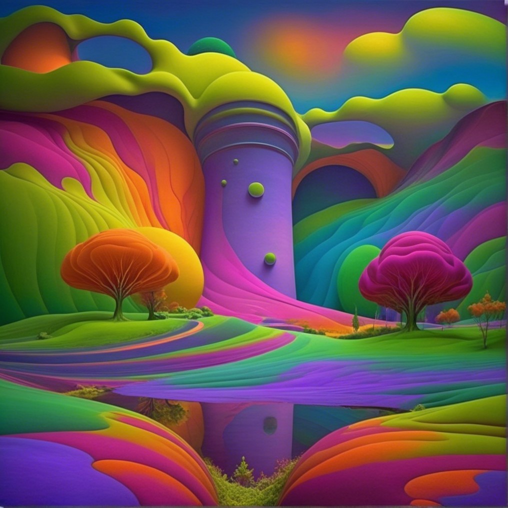 A vivid, surreal landscape features rolling hills in vibrant hues of purple, orange, and green, with fantastical trees and a reflective water body, creating an otherworldly atmosphere.