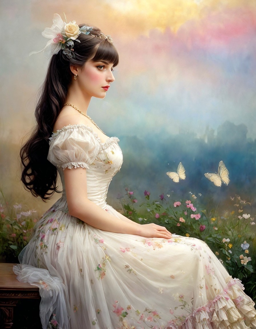 Prompt: This beautiful lady, her fluttering clothes, make my world go round, surreal photography in the style of Louis Icart, encaustic paint, mixed media,