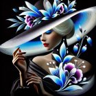 A glamorous woman wears a striking purple hat adorned with flowers. Her stunning makeup and elegant earrings complement a vibrant, abstract background, creating a bold and fashionable look.