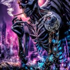 Vibrant Skeleton with Glowing Skin and Wings Amid Rubble