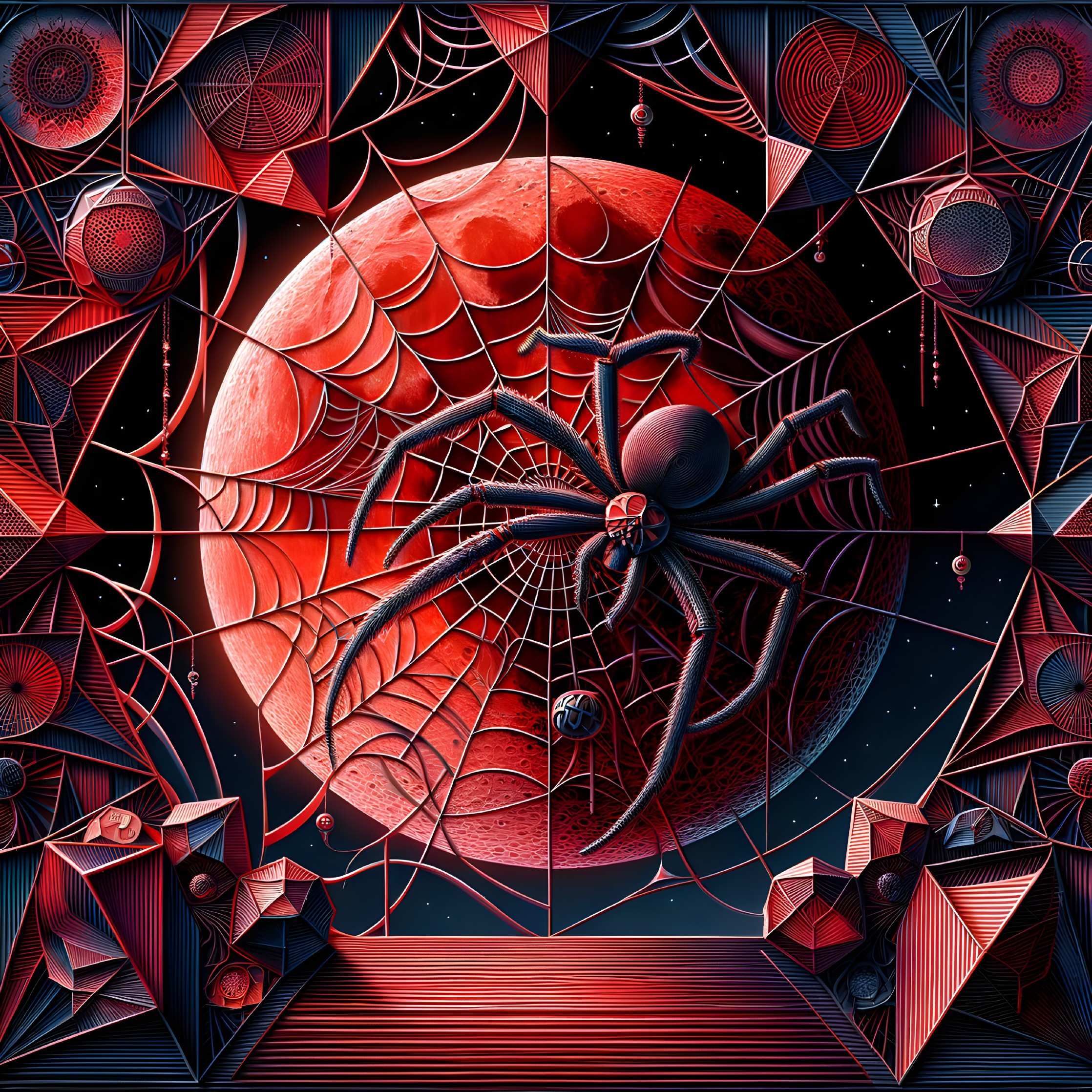 A vibrant, surrealist illustration featuring a large spider amidst geometric webs with a looming red moon and cosmic backdrop.