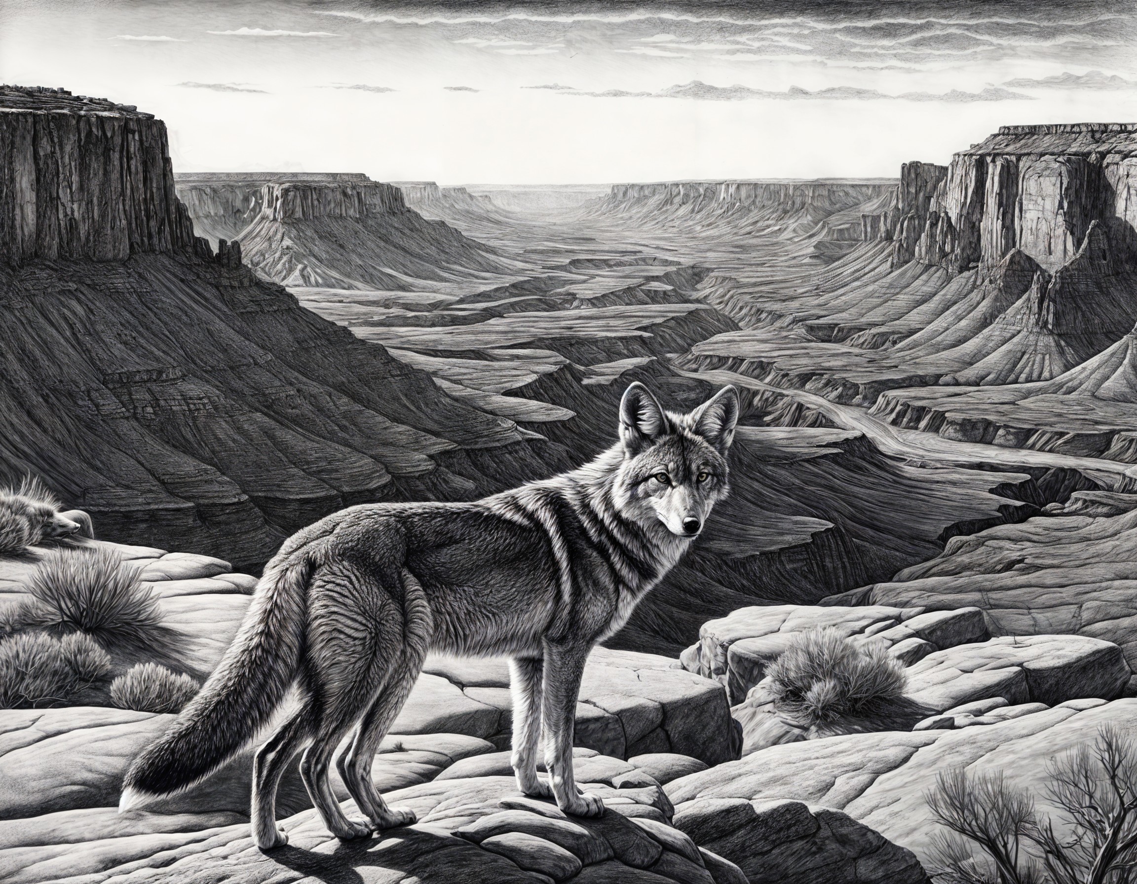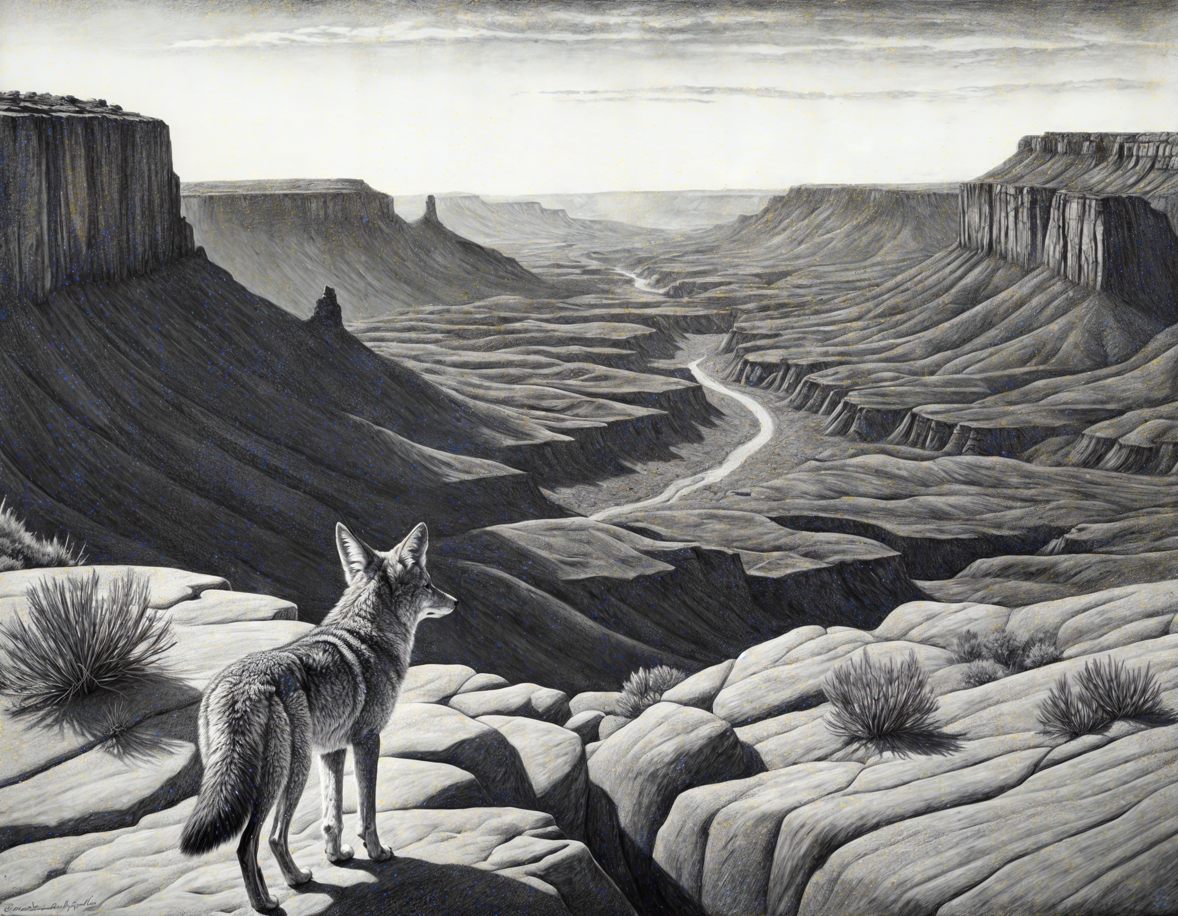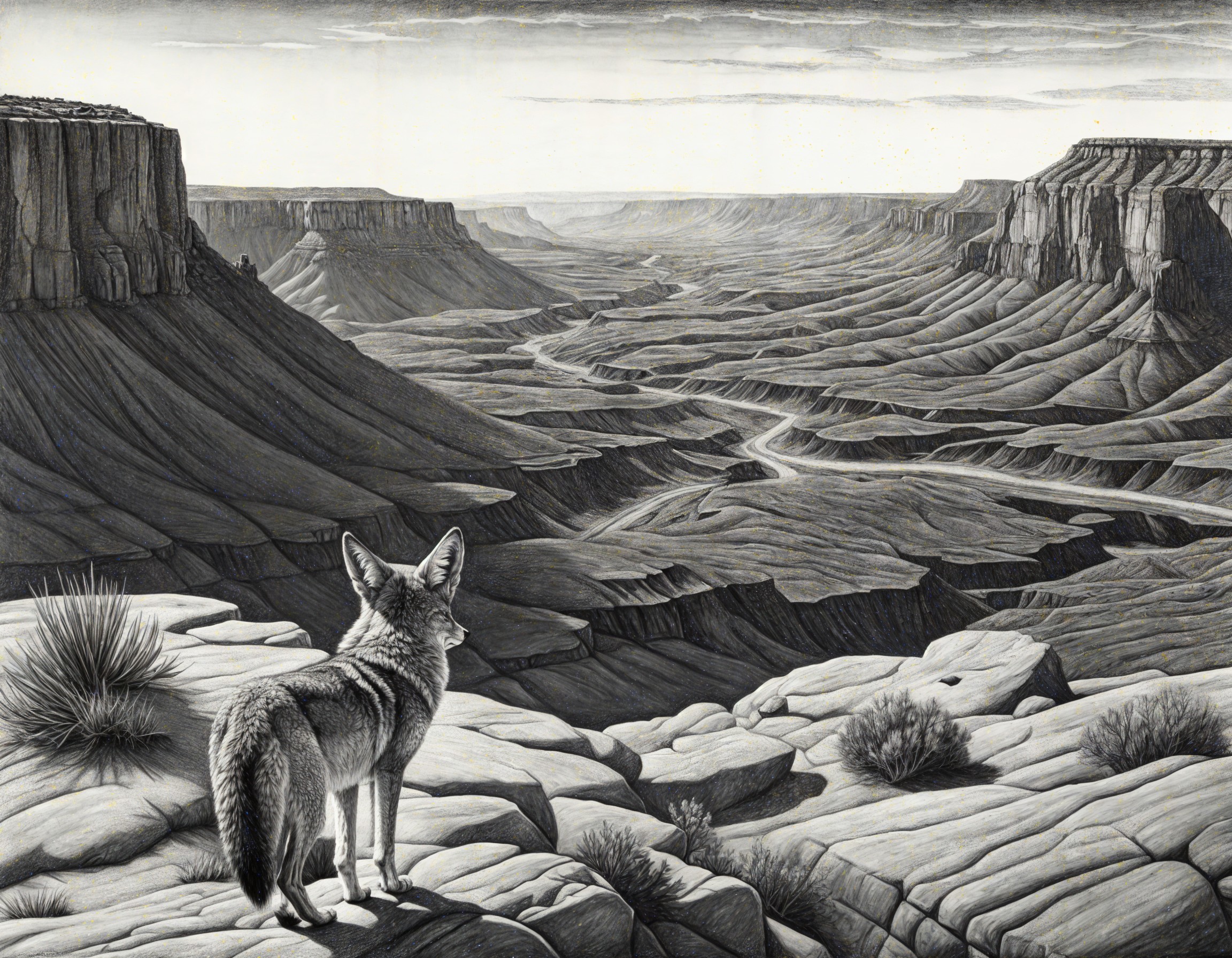 A detailed black-and-white illustration features a coyote standing on a rocky cliff, gazing over a vast, intricate canyon landscape with winding rivers and dramatic rock formations.