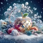 A vibrant, oversized apple made of colorful mosaic tiles sits amidst snowy ground, surrounded by smaller apples and frosted greenery, evoking a whimsical winter wonderland.