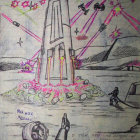 A futuristic scene shows a towering structure on a barren planet, surrounded by explosions and beams of light, while an astronaut gazes in awe at the chaos unfolding around it.