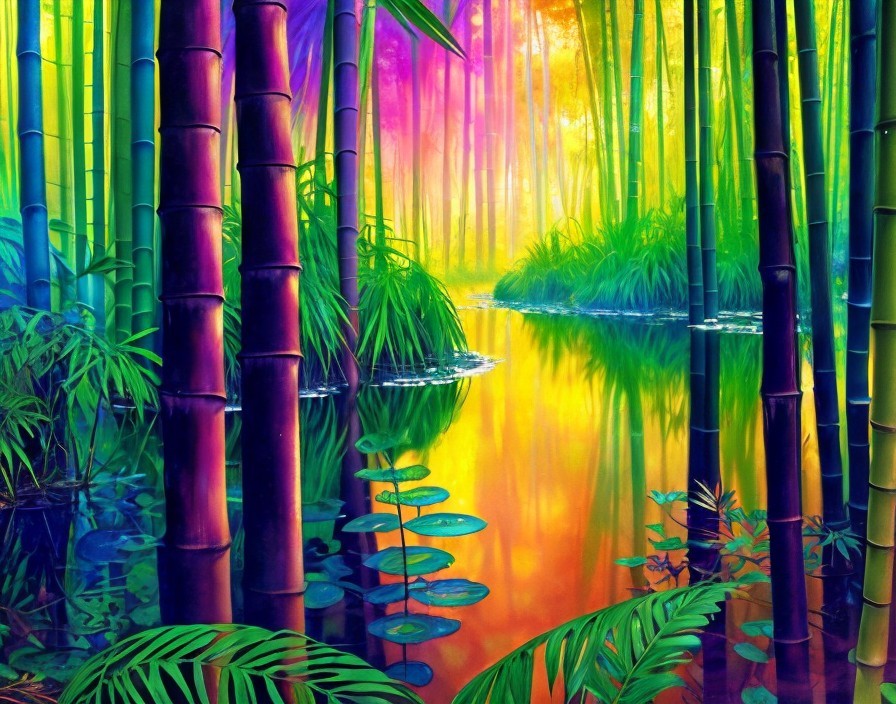 A vibrant, colorful painting of a bamboo forest with a reflective water body, highlighted by sunbeams piercing through the foliage.