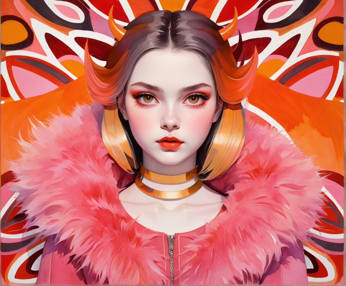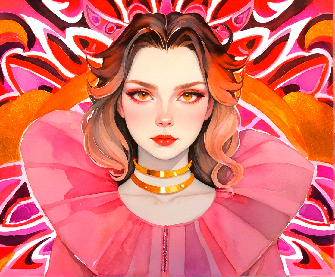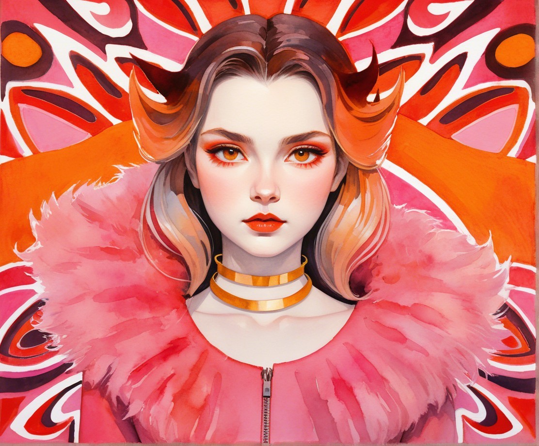 + Prompt:Aquarelle extrusion, thinned gouache paint, stylized lineage drawing, dreamy, nuanced, sift dappled lighting, tetradic color scheme red pink golden orange, energetic, saturated colors, portraiture of juvenile dark Gothical temptress with grey tousled hair and devilish eyes, large collar, fyr details, close-up, headshot, beautiful, cel-shaded, darkened eyeshadow 1.7, multi-layered eyes, fractal line patterns, wispy filaments, intricate detailed flowing hair, great depth and scale, pastel tones, watercolor details, overspray of thinned paint, squiggly wet-on-wet features, reminiscent of Arlie Opal and Emshwiller, stippled, tesselated, coherent, contouring outlines by Susan Seddon Boulet, 3d effects 1.8, parallax occlusion 1.2, octane render illustration 1.5, subtle shadows, raytraced shadows 1.8, divisionism, maximalism, palette of red and greys, gradient inking colors, dyed, hues for facial features by Georgia O'Keeffe, tonalism, dreamscape, fantastical traumacore, foampunk 1.7, stylized lineage illustration 1.5, luminosity 1.3, plasticity 1.3, complexion 1.1, natural essence, eerie ambiance, soft rounded edges, back-lit, high coloring, eroticism, excellent depth and scale, brightness 1.9, maximalism, radiance, dark fantasy art 1.2, surreal contrast tones, american gothic 1.7, softened dynamic lighting, tints by Overton Loyd, Novelty architecture, precise Gelsculpt 64K, weathered, dyed, tiny stacked lines, glossy, quilling, delicate coloring 1.3, sculpted, dappled lighting with red iridescence, brightness 1.9, overall composition by Georgia o'keffee and Arlie Opal,