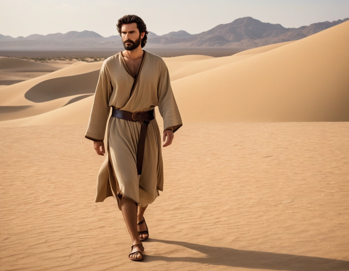 He is dressed in a sand-colored, ankle-length tunic with long sleeves, leather sandals and a sash.