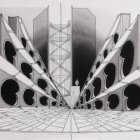 A surreal architectural scene featuring towering concrete structures with large circular openings. A solitary figure stands on a pedestal, emphasizing the vastness and starkness of the environment.