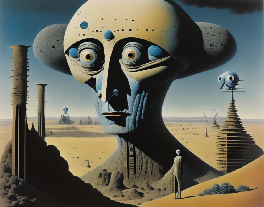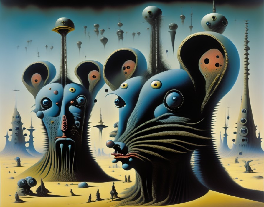 Surreal landscape with alien-like, tentacled entities under a glowing sky, resembling a sci-fi environment.