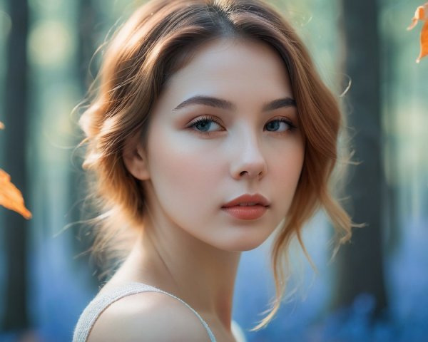 A woman in a white shirt and jeans stands in front of a scenic seascape with heart-shaped balloons in the sky.