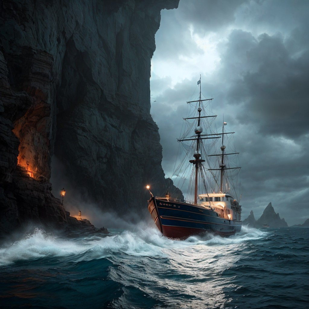 A tall ship navigates stormy seas near towering cliffs under a dramatic, cloudy sky.