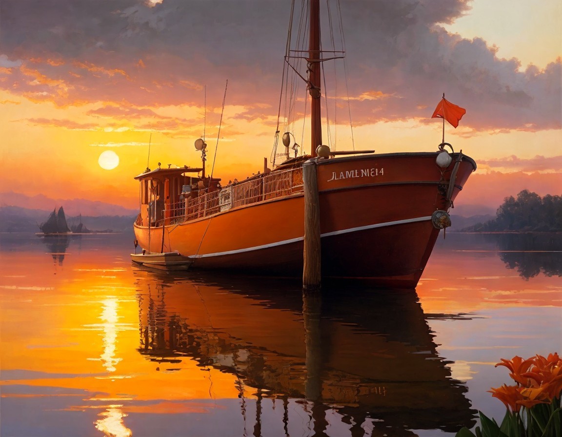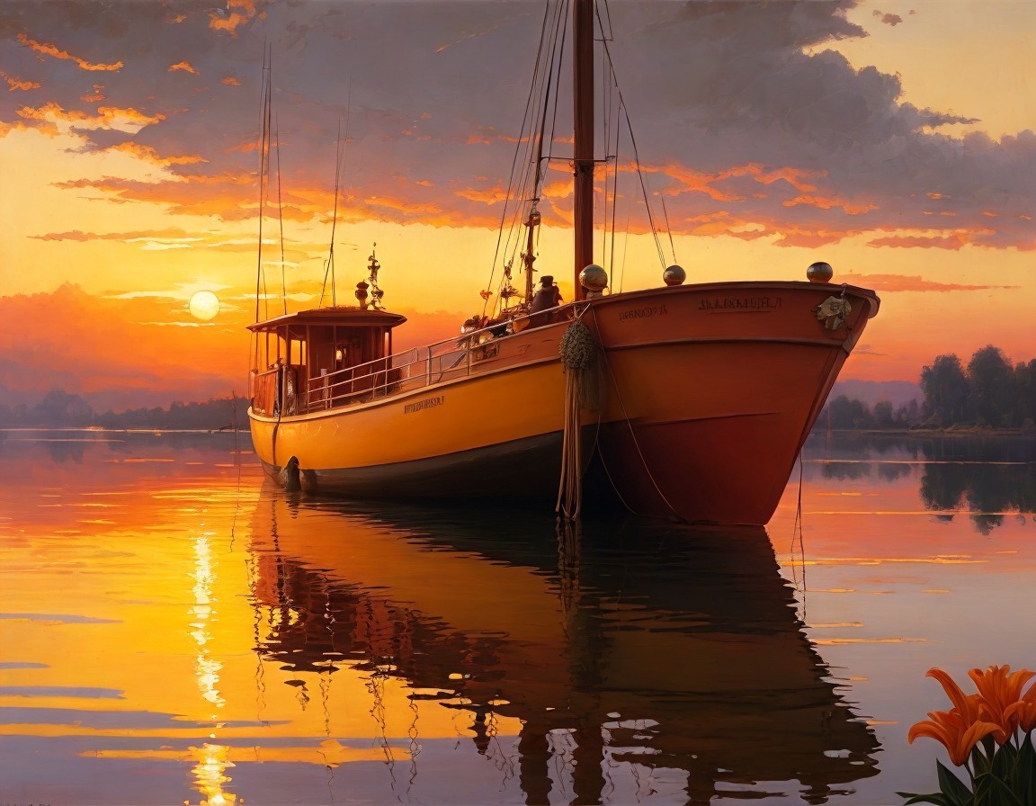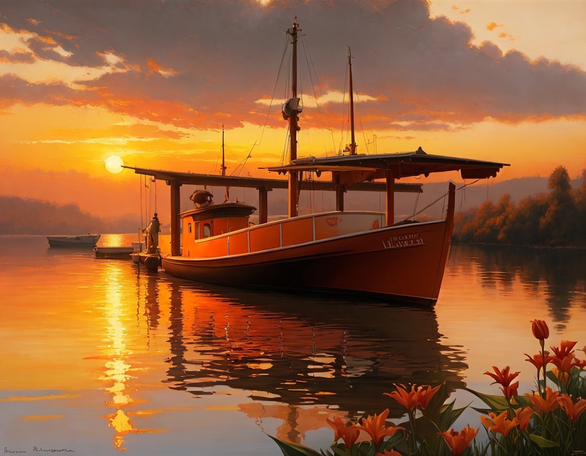A serene sunset over a calm lake with a solitary red boat and vibrant orange lilies in the foreground.