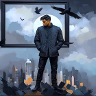 The artwork features surreal figures, including a man in elaborate attire and a woman with an oversized eye, surrounded by dark birds. The background blends soft blues with abstract forms and textures.