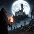 A cloaked figure holds a torch in a moonlit graveyard, surrounded by mist and gravestones. In the background, a dark castle looms ominously atop a hill, enhancing the eerie atmosphere.