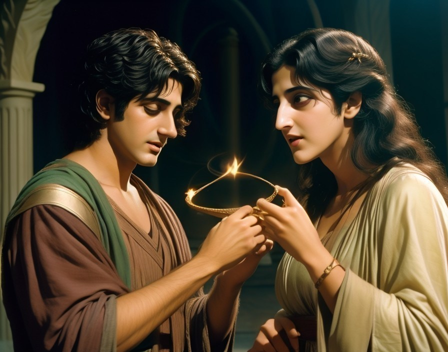 Two individuals in antiquated attire appear captivated by a glowing band between them, surrounded by classical architecture.