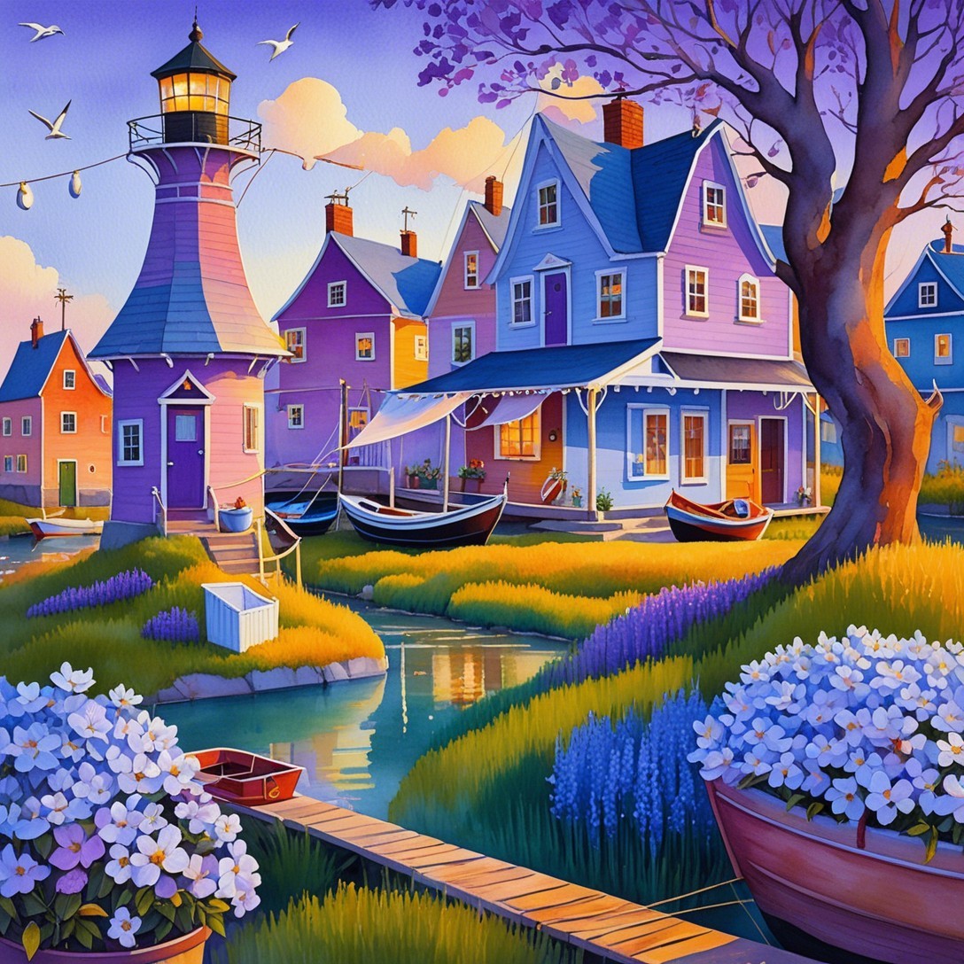 A vibrant illustration of a quaint coastal village with colorful houses, a lighthouse, a serene river, and blooming flowers under a sunset sky.