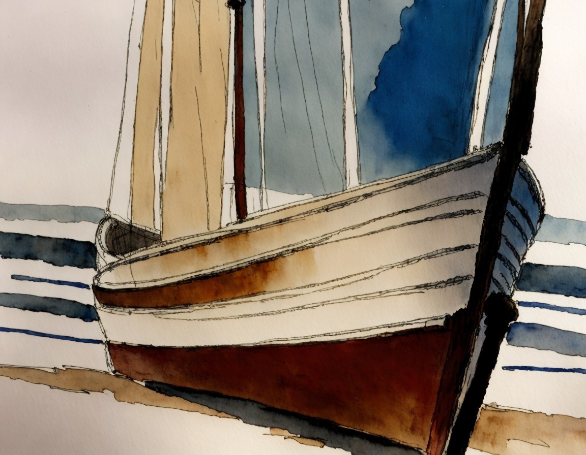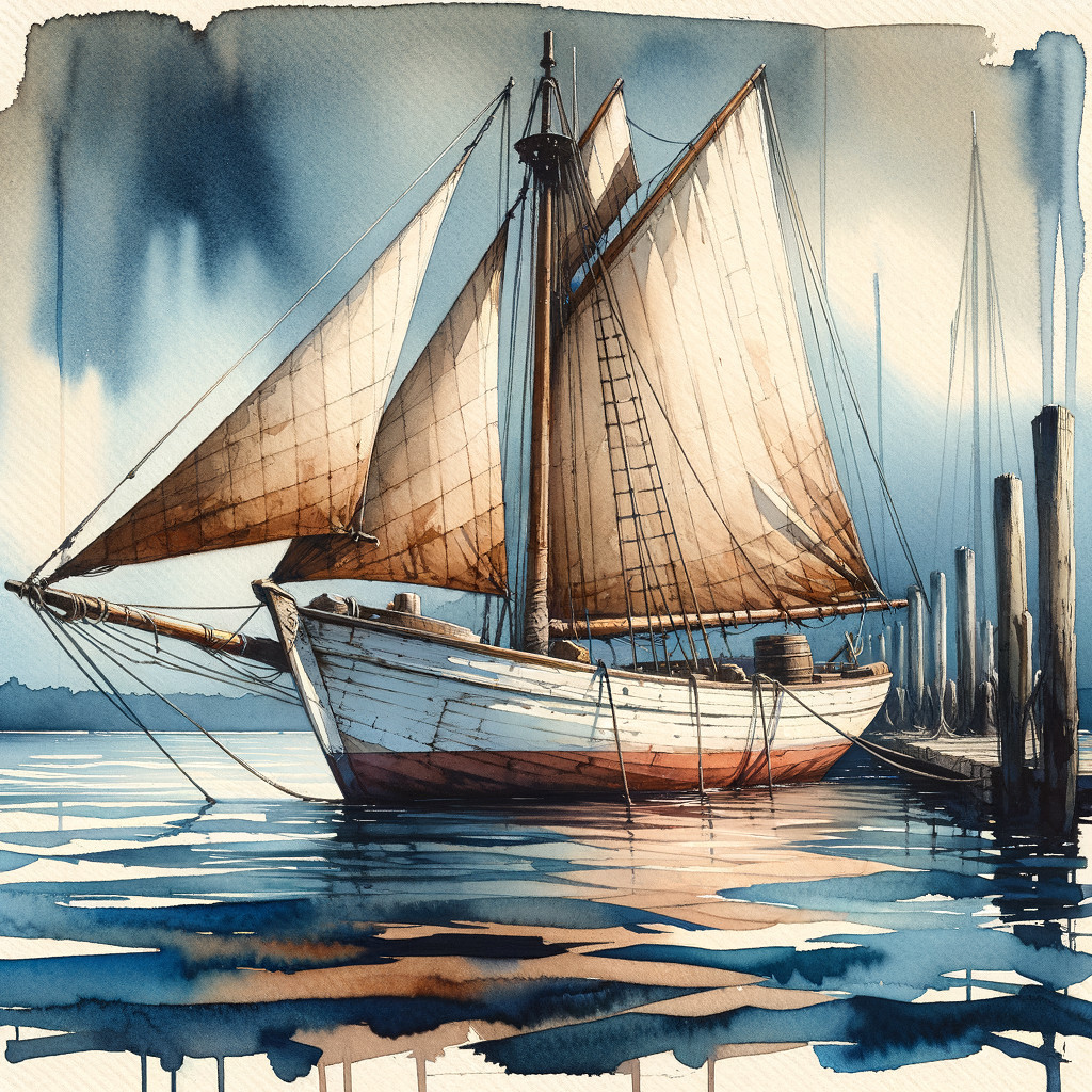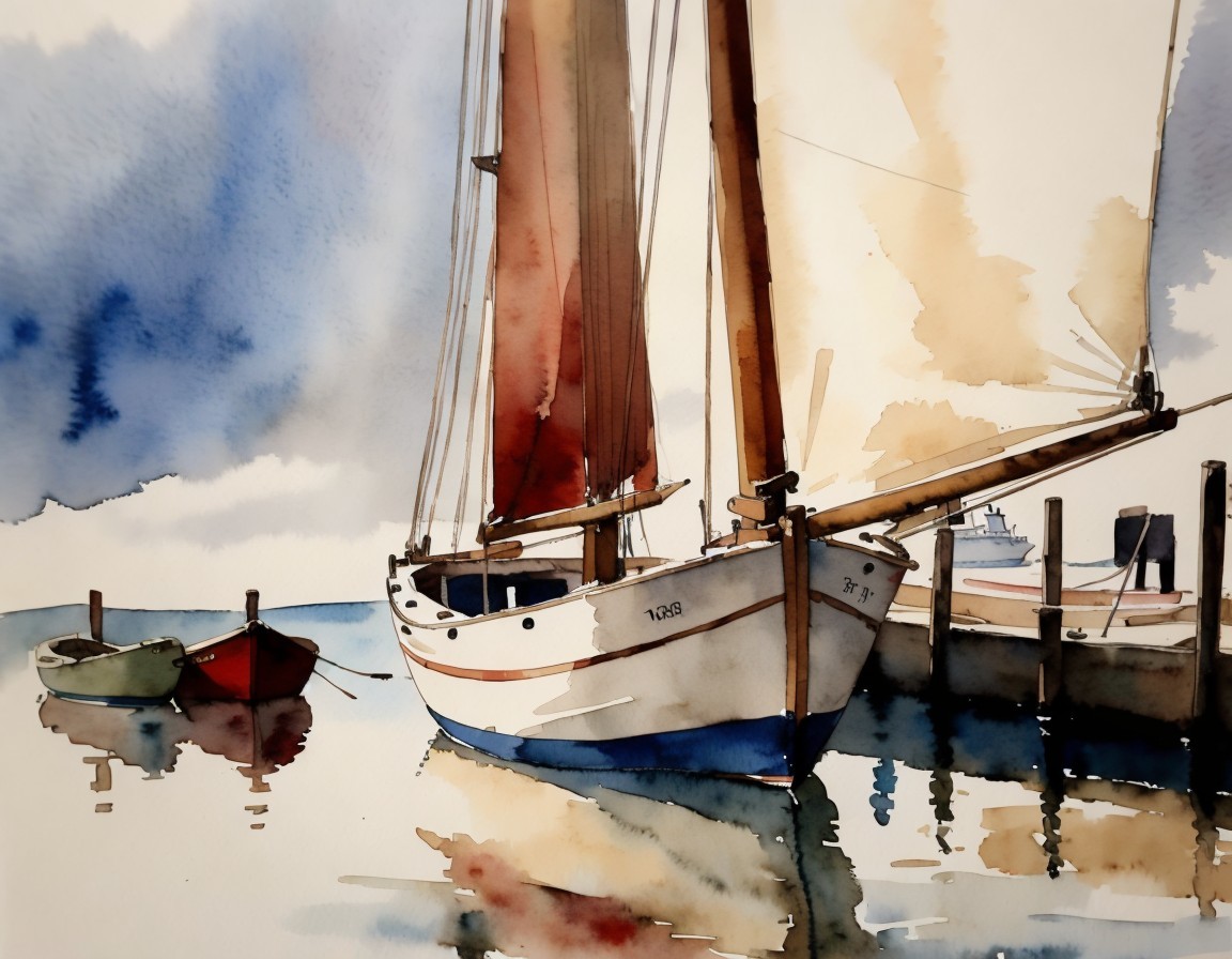 A watercolor painting of a sailboat named "Valerie" with red sails, on calm waters, with other boats in the background under a cloudy sky.