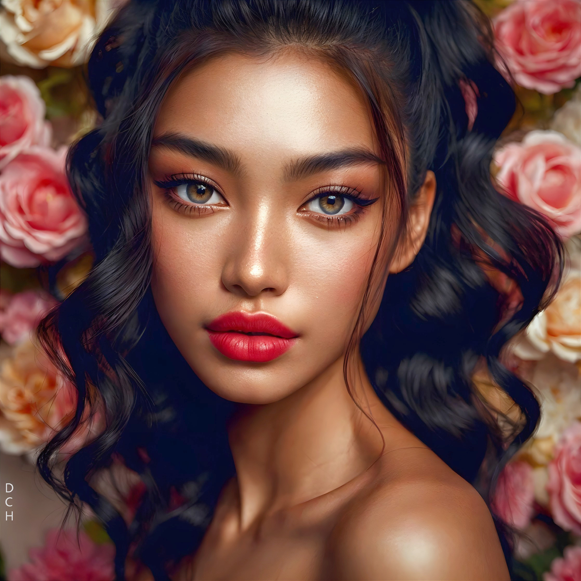 A portrait of a pretty woman with striking eyes, red lips, and a floral backdrop.