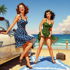 Two women in vintage polka-dot dresses stand on a sunny beach, smiling and posing beside a classic car. The vibrant scene features palm trees, gentle waves, and a nostalgic summer vibe.