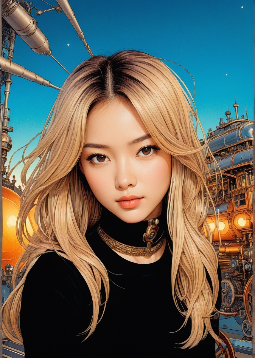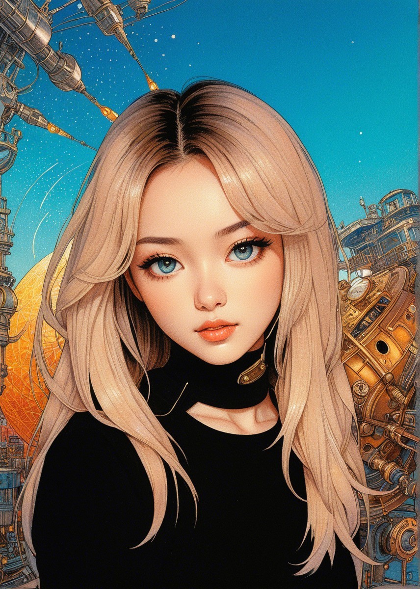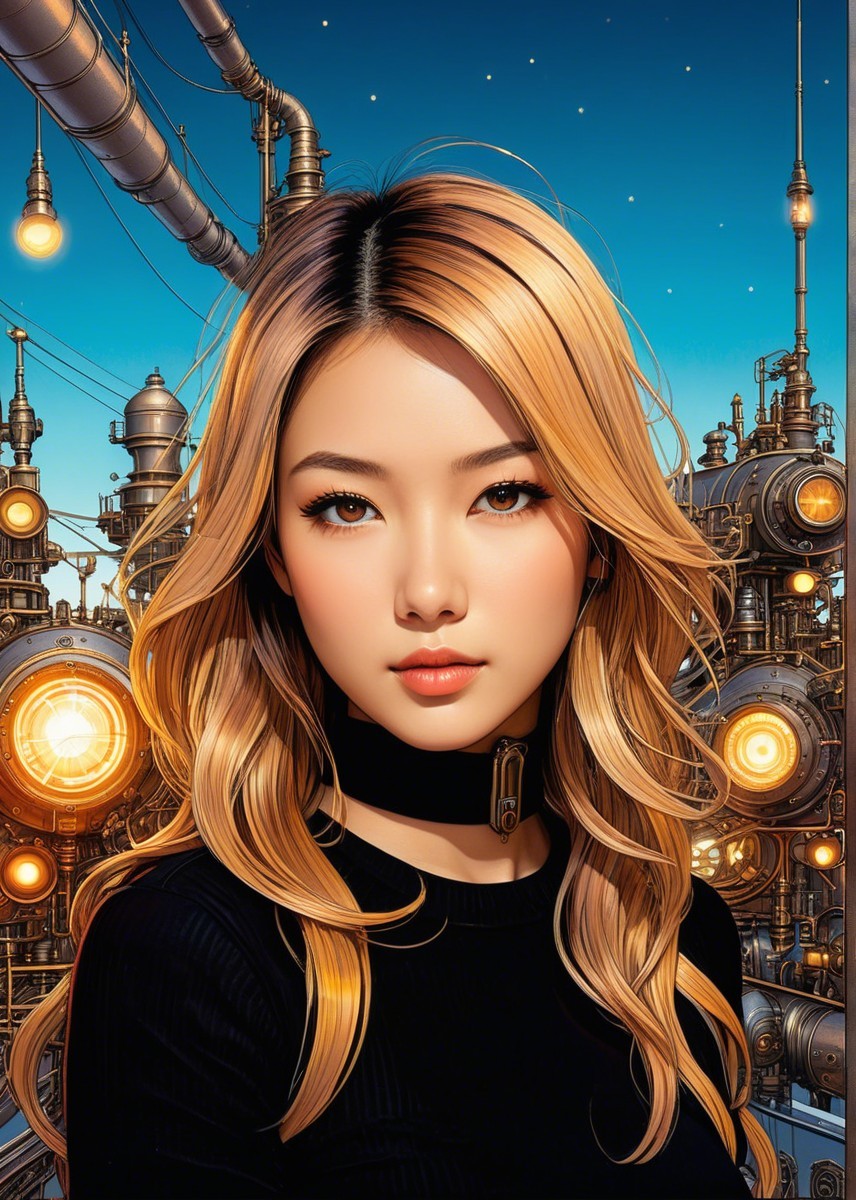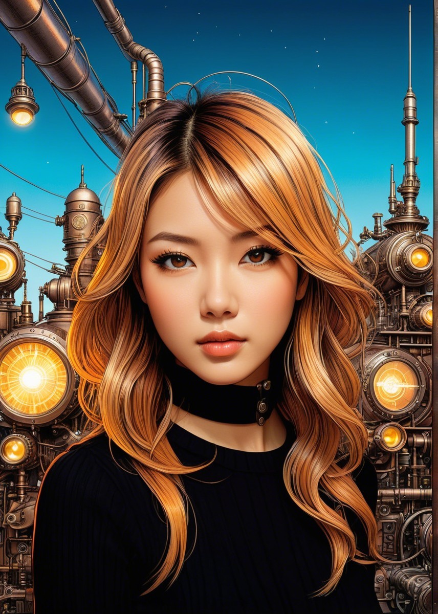 Prompt: Style of Hiroaki Samura, steampunk details, stacked-up perspective, stylized lineage drawing, line-art features, small reflections, technologically advanced world, fantastic realism with elements of futurism, beautiful futuristic girl; retrofuturistic fashion; shiny polarizing metal. Warm coloring, pointillism details, squiggly line-art features, tiny and lean details, windy streaks, chromatic induction, gradient inking colors. Retropunk. Dof, layered, great depth and scale, bokeh, dbeh, novelty architecture. Comic book cover art. Bubblegum witch style, intricate line-art showcasing retro-futuristic elements, pen and ink illustration blending Cyberpunk and foampunk aesthetics, set in a 1950s Retrofuturistic Psychedelic Style, delicate yet mysterious aura, multi-layered eyes, framed by long dark wavy hairbangs, gaze. patchwork in the style of Man Ray, Laurel Burch, William Turner and hues by william bradley. Stippled, tesselated, cel-shaded, visible defined lineage, parallax occlusion 1.4, debeh, bokeh, uhd, hdr, vfx, elements of casual line and wash sketch with a foampunk twist. Stacked-up perspective, multi-polar, very fine lineage, tall and lean details, style of Overton Loyd and Ed Binkley, parallax occlusion, ambient occlusion, and raytraced shadows enrich the visual experience,softened with warm coloring, stylized lineage and high plasticity. Parallax occlusion, subsurface scattering. Serene, summoning, quaint, slighly exaggerated features, simplistic, gradient inking colors, golden details, elegant, shiny, estranged metallic colors for embossed patterns, uhd, hdr, dof, bokeh, debeh, precious, joyful cozy, retrofuturistic details, extreme level of detail. High quality of color rendering and reflections.