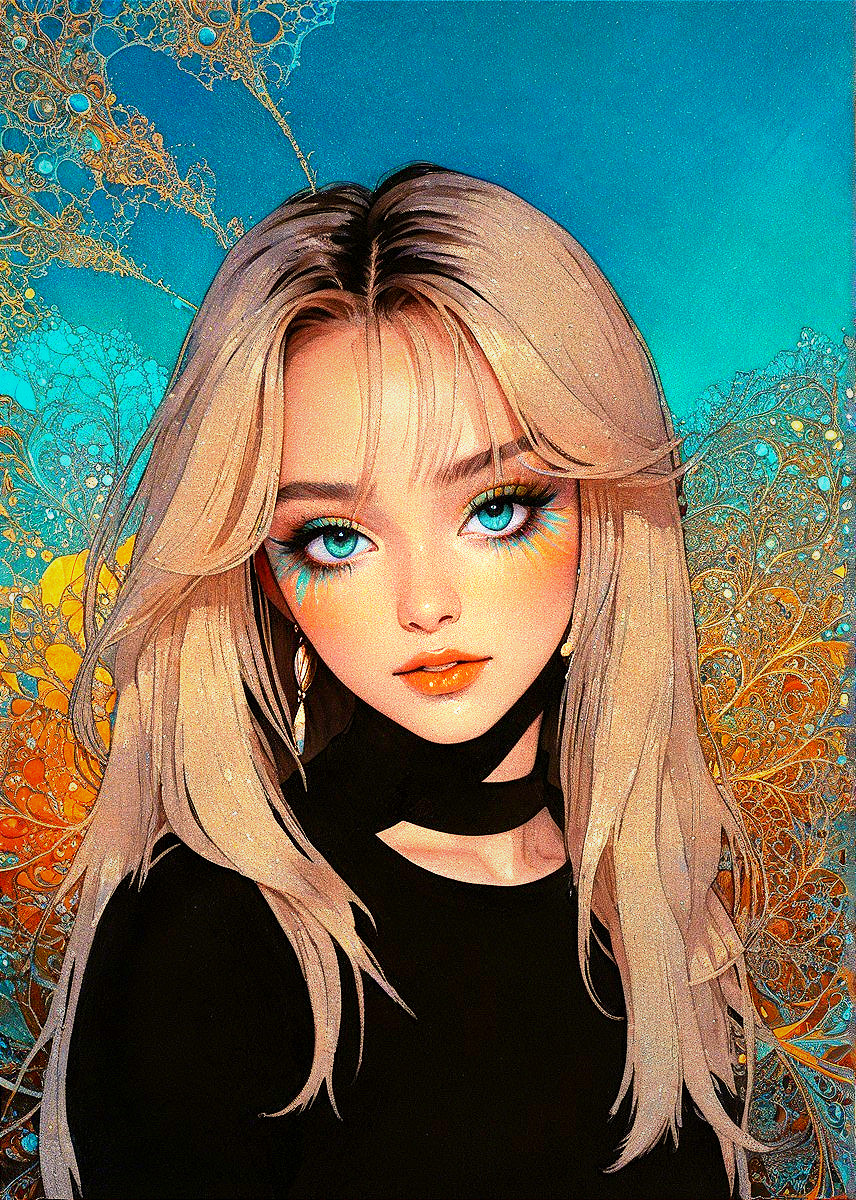 + Prompt:Aquarelle extrusion, stylized lineage drawing, dreamy, nuanced, tetradic color scheme blue cyan golden orange verdant, energetic, saturated colors, portraiture of juvenile beautiful temptress withdevilish eyes 1.7, fractal line patterns, warm color palette with iridescent shimmer, meticulously combed hair details, surreal light transitions, intricate indentations for depth. Channeling Susan Seddon Boulet with contouring outlines, radiant fractured connections, Lomography Konstructor multi-exposure photography approach. Chiaroscuro lighting reminiscent of Raoul Dufy, Andy Russell, and Margaret Keane, casting warm pink and pale bluish backdrops. Incorporate cubistic fragments for a mysterious, enigmatic atmosphere, filaments, intricate forest, detailed roots, great depth and scale, earth tones, watercolor details, overspray of thinned paint, squiggly line-art features, reminiscent of Tom Bagshaw and Emshwiller, stippled, abstract, coherent, contouring outlines by Susan Seddon Boulet, 3d effects 1.8, parallax occlusion 1.2, octane render illustration 1.5, subtle shadows, raytraced shadows 1.8, divisionism, maximalism, palette of white and greys, gradient inking colors, dyed, hues for facial features by Georgia O'Keeffe, colored line drawing merged with watercolor painting, tonalism, dreamscape, traumacore, foampunk 1.7, stylized lineage illustration 1.5, luminosity 1.3, plasticity 1.3, complexion 1.1, natural essence, winterly desolate ambiance, soft rounded edges, back-lit, pop art nightmare, high coloring, eroticism, excellent depth and scale, maximalism, radiance, cottagegore 1.2, surreal contrast tones, american gothic 1.7, dimmed dynamic lighting, tints by Overton Loyd, octane Novelty architecture, precise Gelsculpt, weathered, dyed, tiny stacked lines, glossy, quilling, delicate coloring 1.3, sculpted, greyish lighting with blue iridescence, brightness 1.9, overall composition by Georgia o'keffee and Arlie Opal,