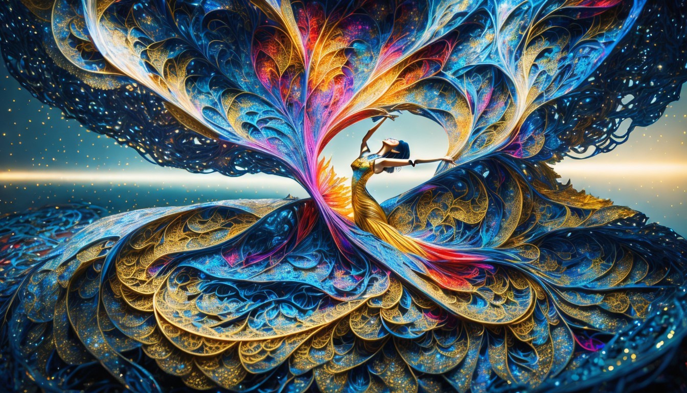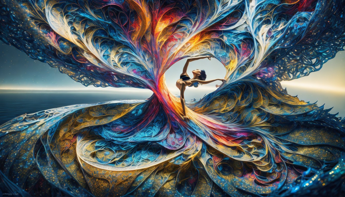 Dancer Surrounded by Colorful Patterns and Sparkles