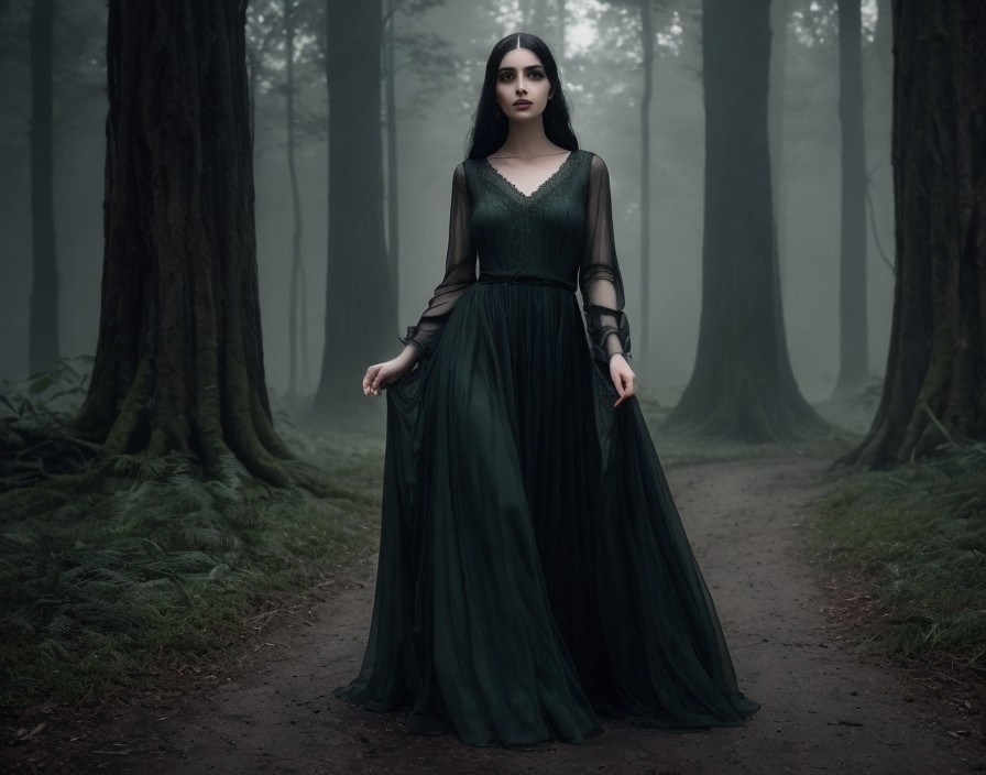 A mystical figure in a flowing dark green gown stands in an enchanted forest, surrounded by tall trees shrouded in mist, exuding an ethereal and enchanting atmosphere.