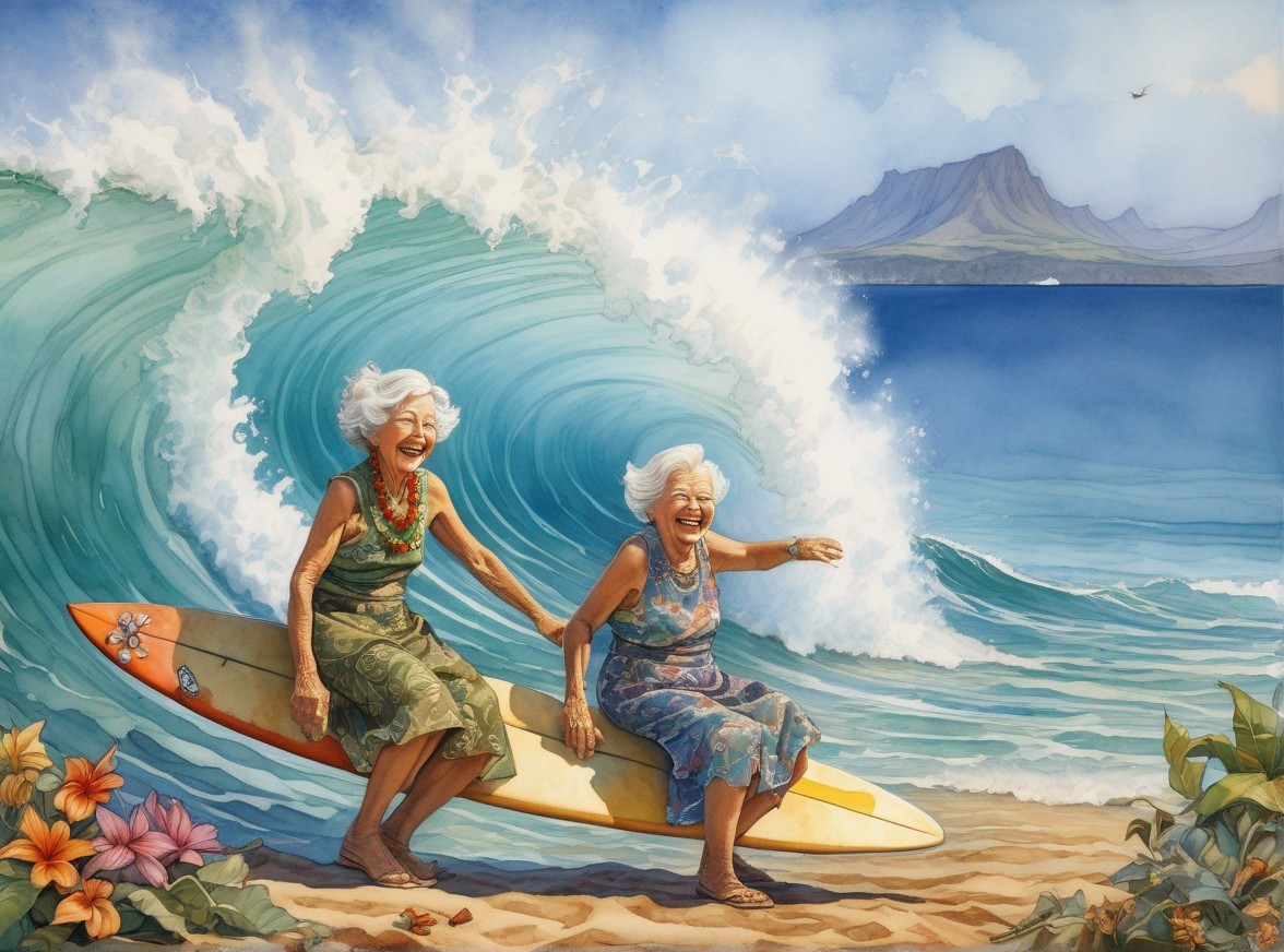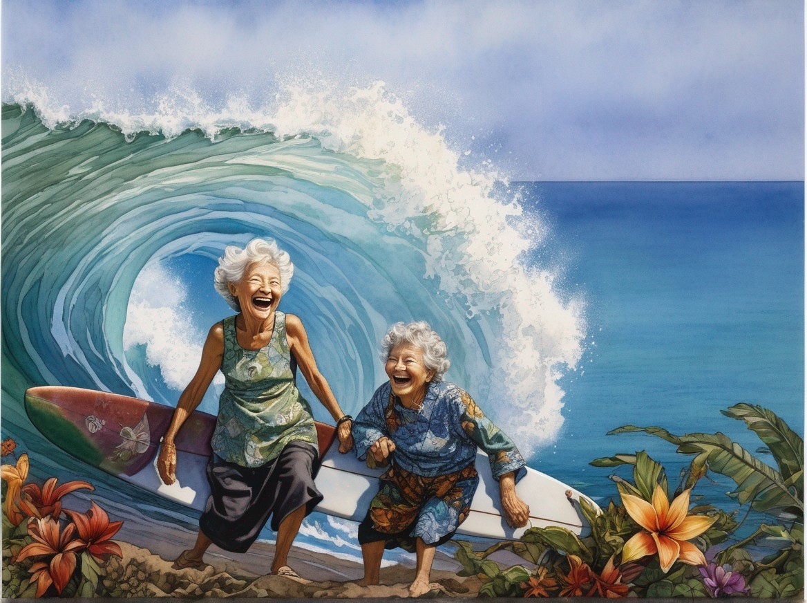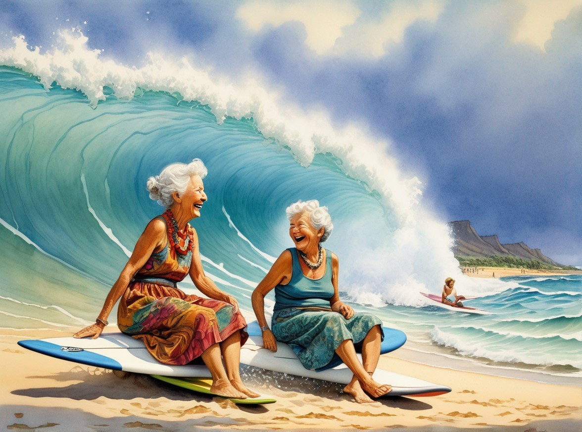 Two joyful elderly women sitting on surfboards, laughing under a large wave backdrop, evoking a carefree, adventurous spirit.