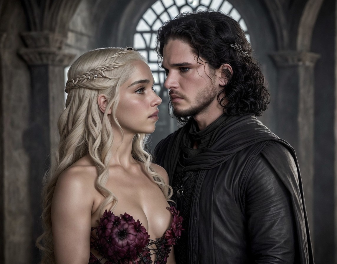 A woman with braided blonde hair and a man with curly dark hair, both in medieval attire, share an intense gaze in a stone hall. Jon Snow and Daenerys Targaryen as Hades and Persephone.