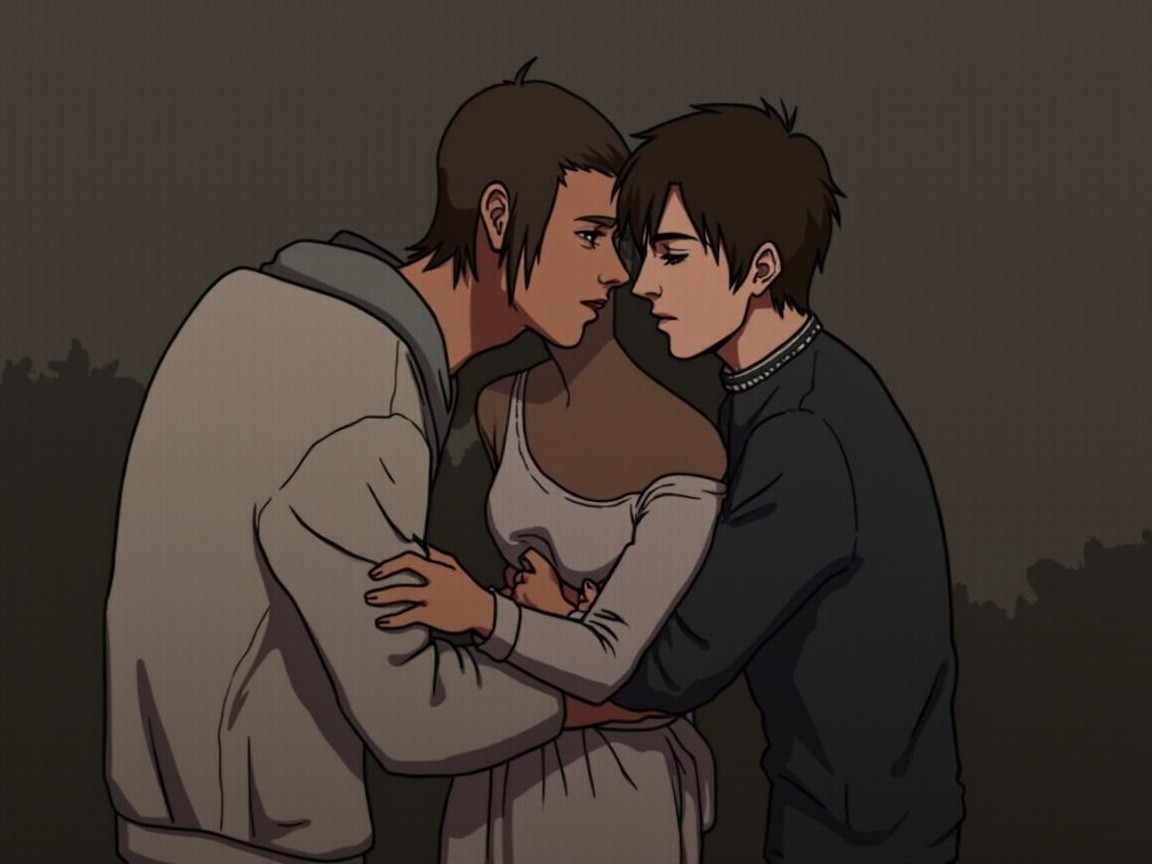A tender moment between two characters, faces close together. Their expressions convey deep emotion, set against a softly lit indoor background, suggesting intimacy and connection.