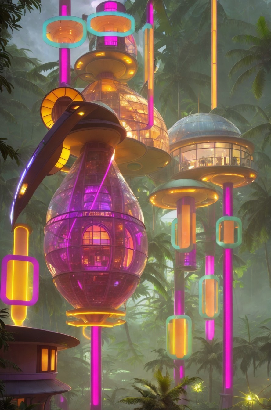 + Prompt:a futuristic round multi-storey house with a transparent dome, with glowing windows, in a tropical valley, among green overgrowth and tropical trees, a spaceship next to the house, in the rays of the rising sun, concept art with 16L resolution, extremely detailed, high definition, photorealistic, Thomas Kincaid, Ferdinand Knab, Niki Boehme