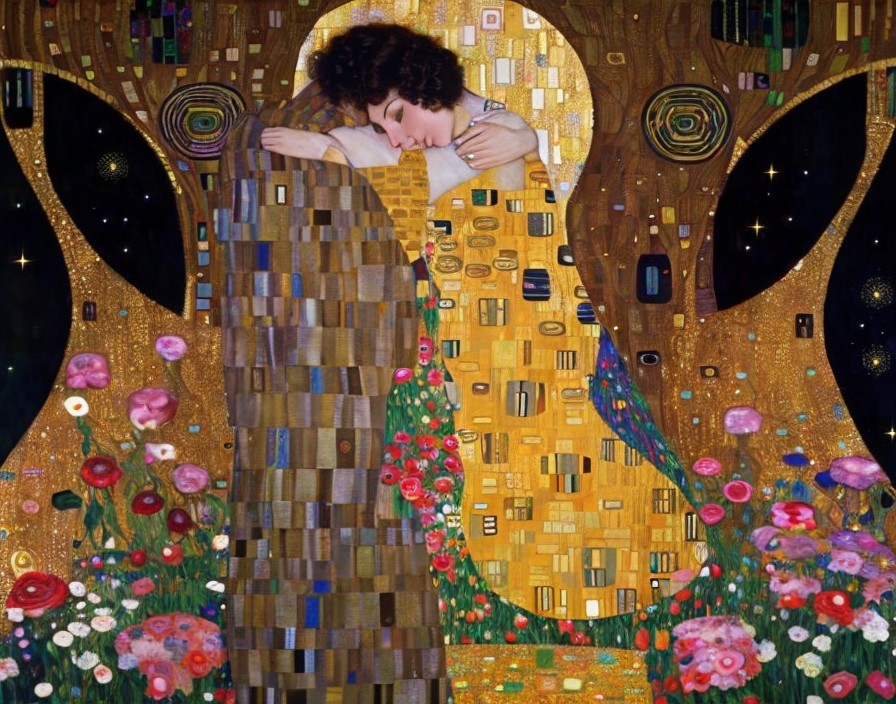 Dark Curly-Haired Woman on Flowery Mound Against Gold Background