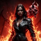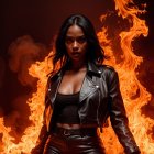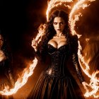 A striking woman in a dark corset stands amidst fiery flames, her long hair flowing dramatically. The intense red and black backdrop enhances her captivating presence and mystical aura.