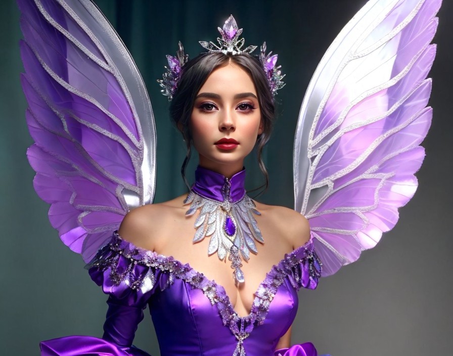 A woman dressed as a fairy with purple wings, a tiara, and a matching elegant gown, adorned with crystals.