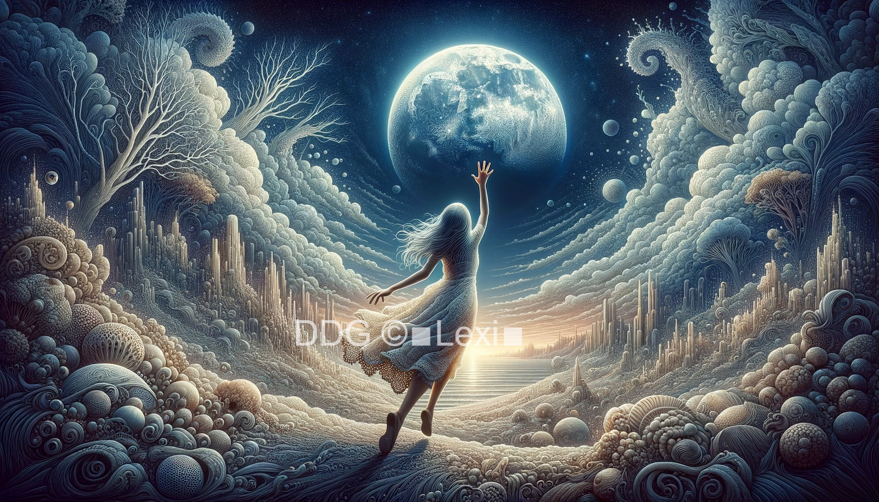 The prompt describes a detailed and dreamlike scene where a girl aspires to touch the moon. The setting is maximalist with sharp, defined details and high-resolution imagery.