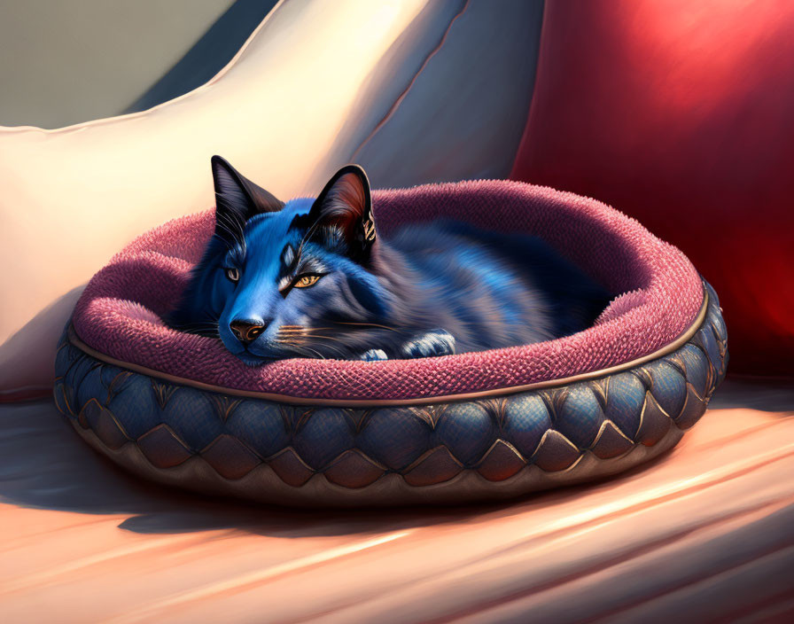 Blue Dragon Resting in Purple and Gold Pet Bed