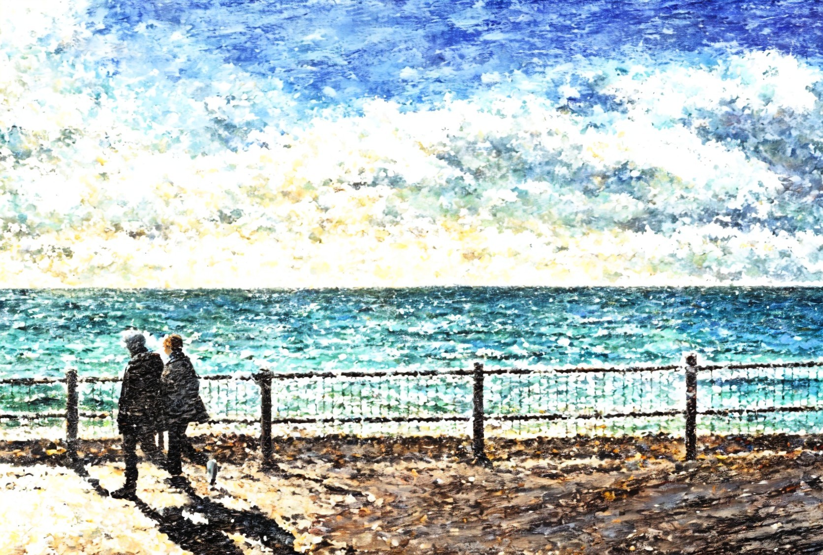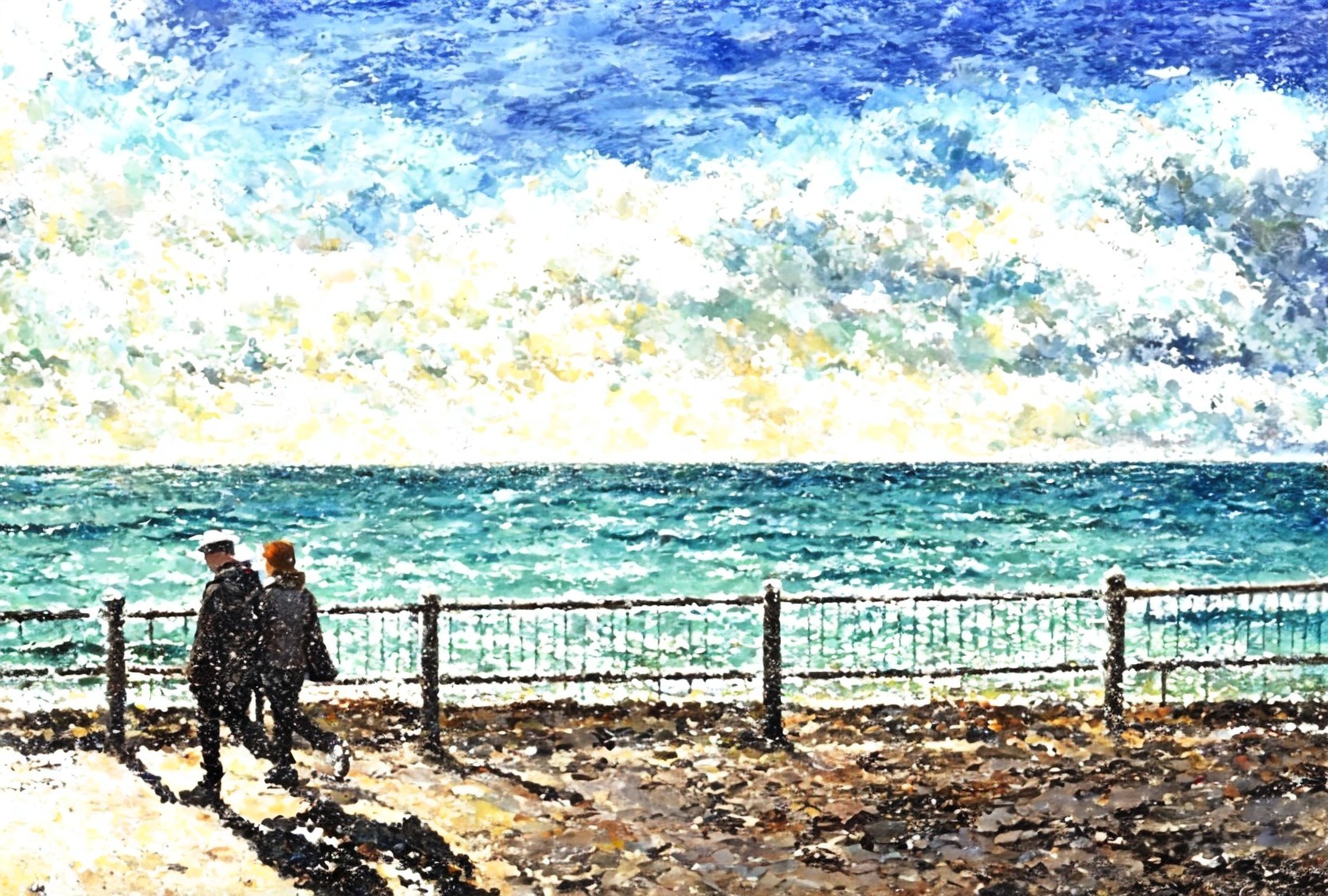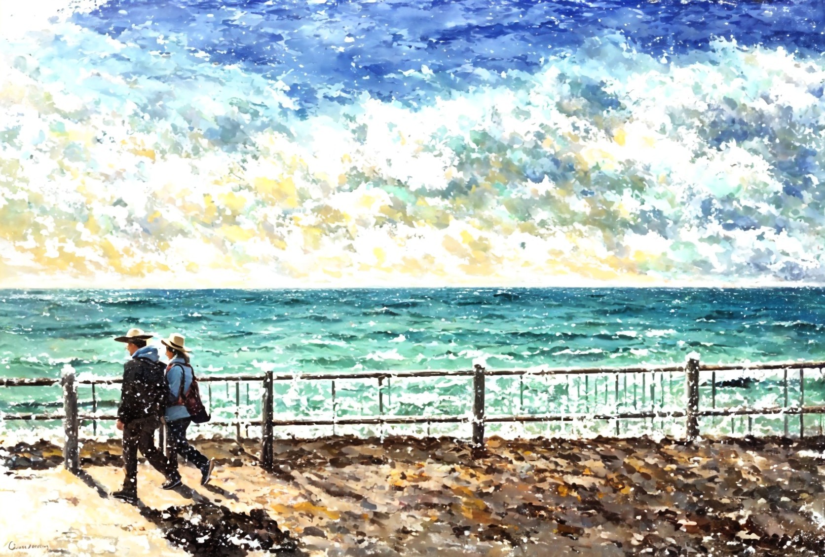 Two individuals in hats by turbulent sea with crashing waves and dynamic sky.