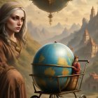 A woman in traditional attire stands beside an ornate, balloon-style vehicle, set against a mountainous landscape with ancient structures, combining elements of elegance and fantasy.