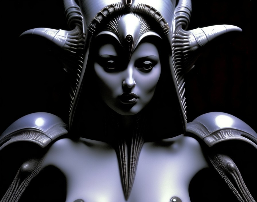 A 3D rendering of a futuristic female character with silver skin, a high-collared outfit, and a red glowing eye amidst tubular structures.